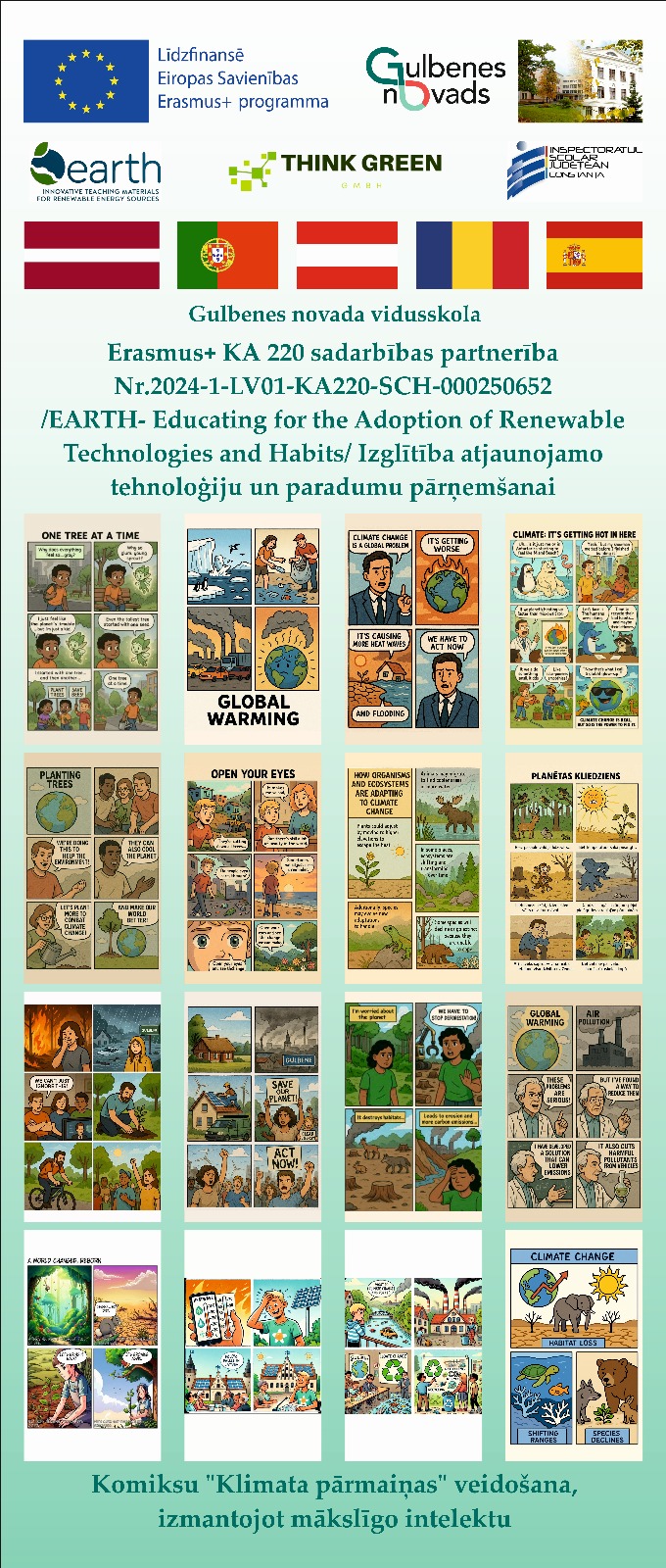Gulbenes novada vidusskola dalījās pieredzē, kā skolēni un skolotāji pilnveido prasmes veidot vides komiksus, attīstot mākslīgā intelekta doto iespēju motivētu izmantošanu. Savukārt skolotāji izstrādā klimata pārmaiņu stratēģiju, diskutē par risku vadības un menedžmenta ieviešanā partnerībā.
